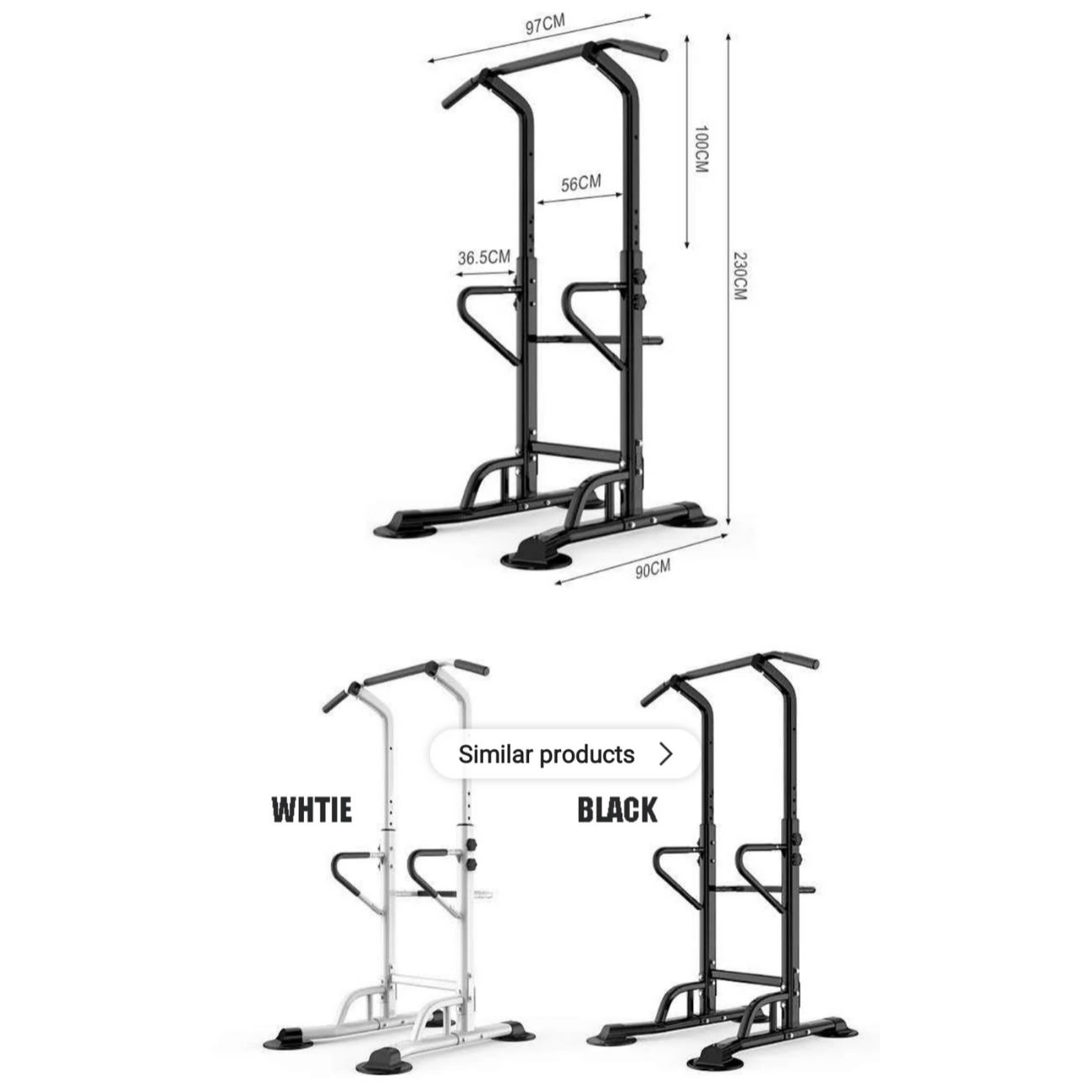 CARACTERISTICAS: Altura ajustable (1,55m / 1,8 m / 2,30 m) para dominadas. Barra dominadas con agarre de goma antideslizante, longitud de 97 cm. Ancho de paralelas de triceps de 56 cm (distancia ideal para no dañar el hombro). Base 75 cm x 90 cm. Fácil armado. Peso optimizado: 14 kg. Peso máximo soportado: 200 kg.