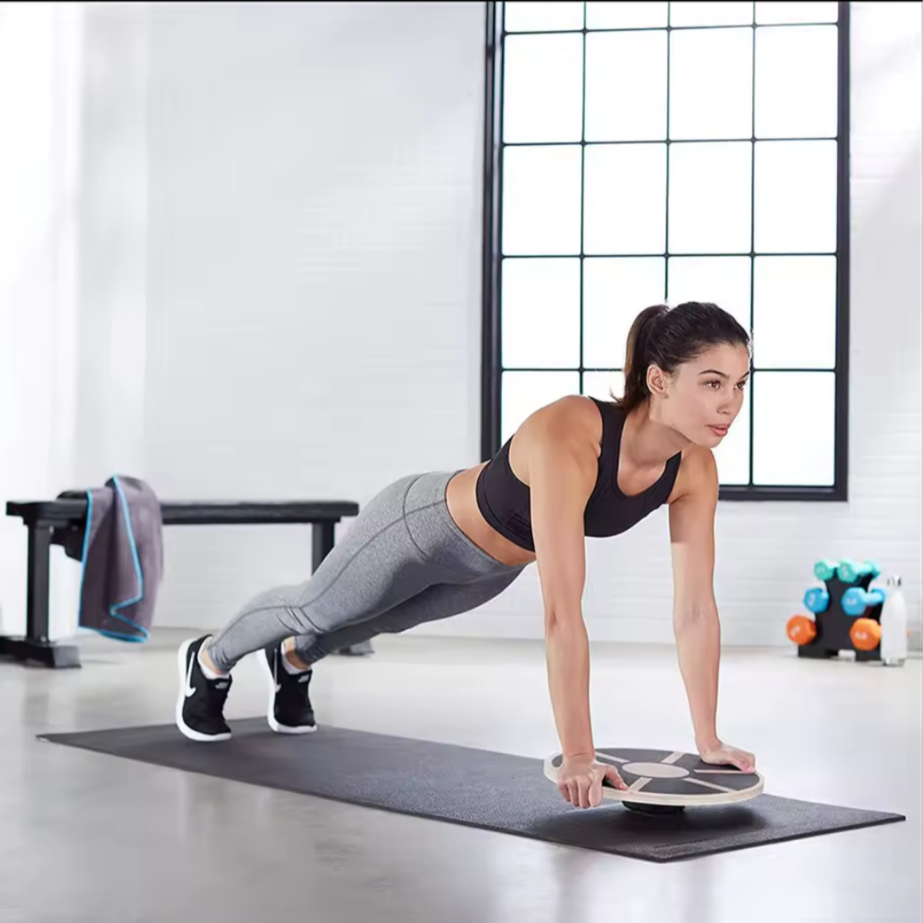 Tabla de equilibrio de madera con capa de goma antideslizante, diseñada para entrenar equilibrio, coordinación y fuerza de piernas y core en casa o en el gimnasio. Su superficie de madera resistente y la goma antideslizante ofrecen un contacto seguro y cómodo, mientras que la base inestable genera oscilación que desafía la estabilidad y mejora la propiocepción.