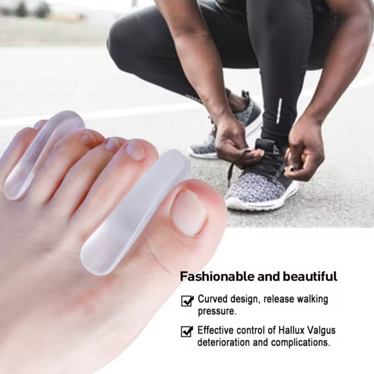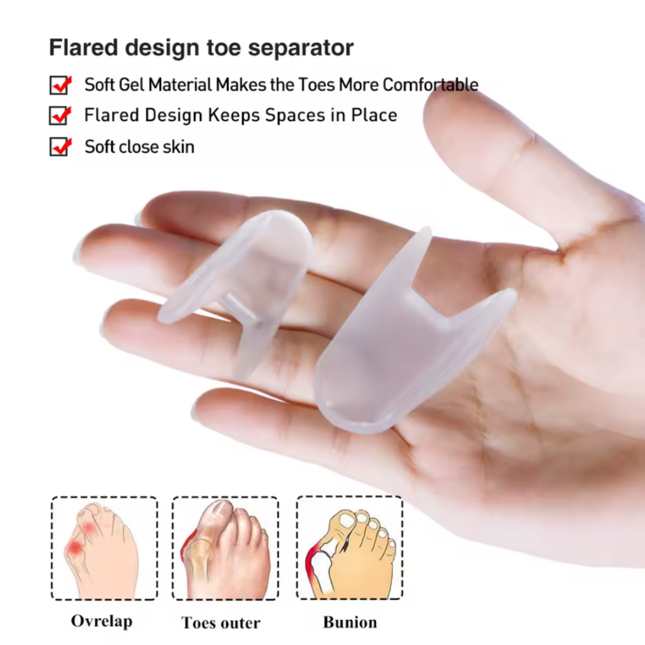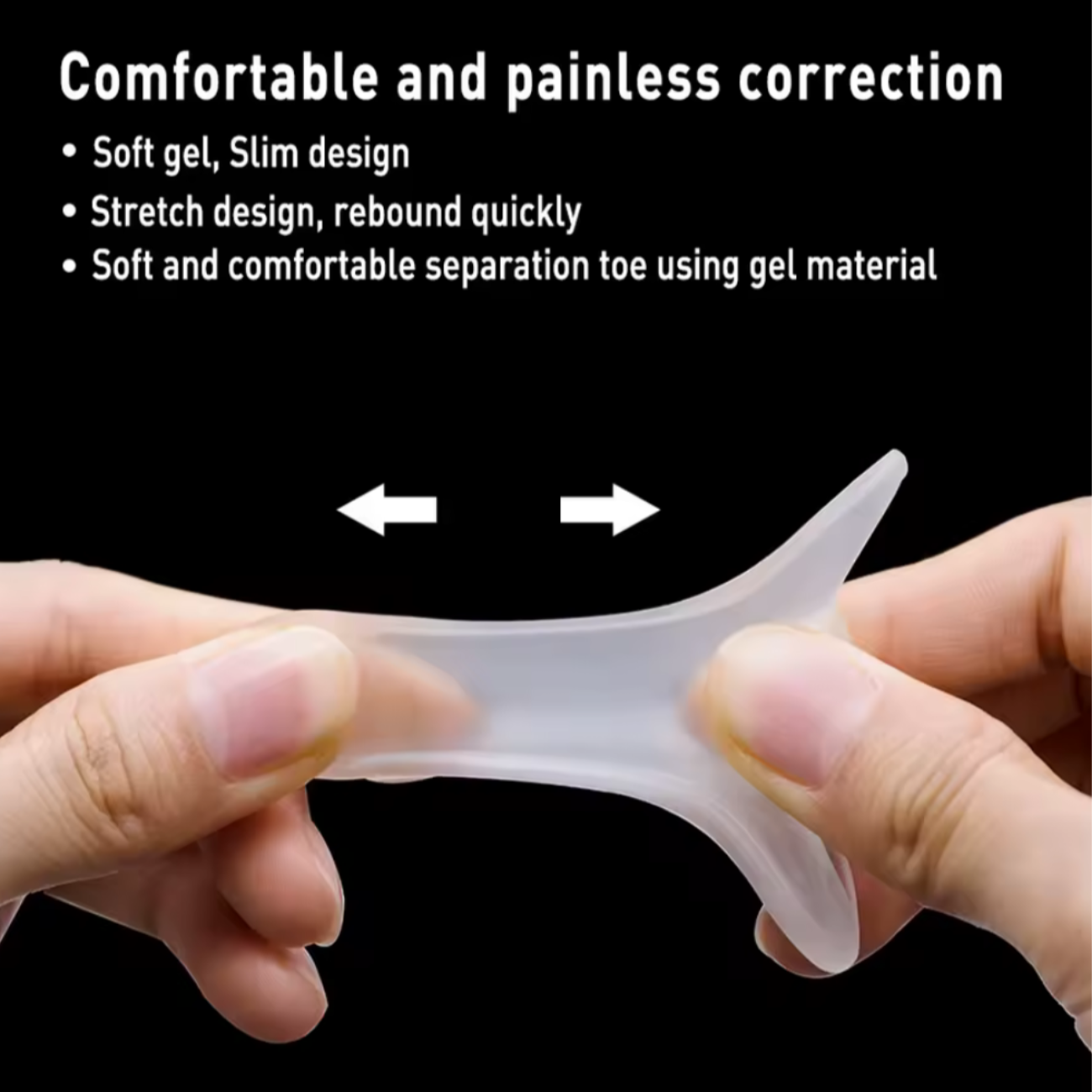 ¿Sufres de juanetes o molestias en los pies? Nuestro corrector en forma de A, hecho de silicona suave y flexible, es la solución perfecta para aliviar el dolor, prevenir la progresión del juanete y mejorar la alineación de tus dedos.