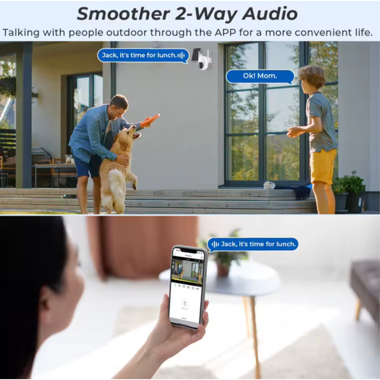 Con visión nocturna infrarroja y a todo color, podrás obtener imágenes claras incluso en completa oscuridad. La función de audio bidireccional, con micrófono y altavoz impermeables, te permite interactuar con familiares, mascotas o disuadir visitantes no deseados, sin importar la distancia. Además, su control PTZ te ofrece un giro de 270° horizontal y 90° vertical, brindándote un amplio campo de visión.