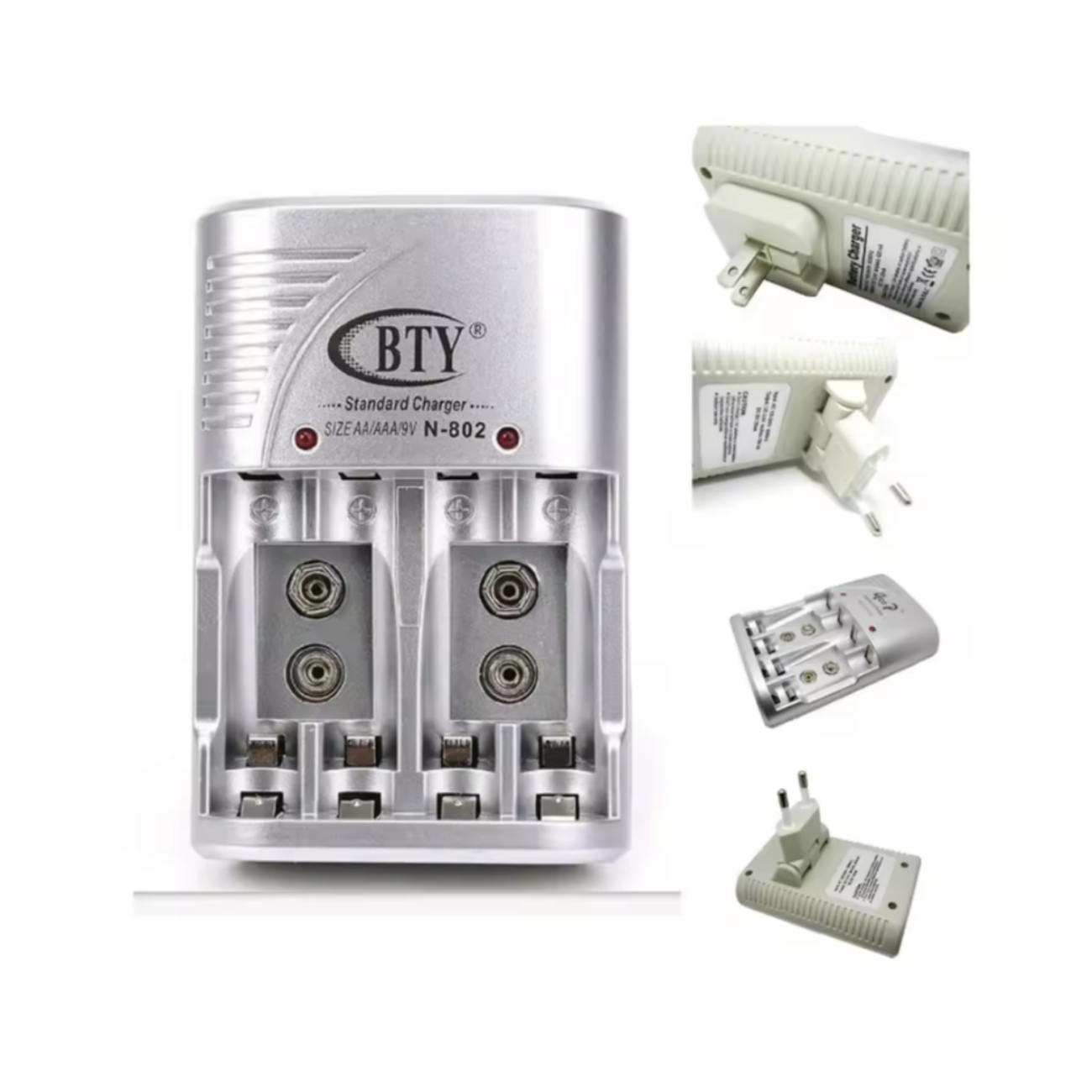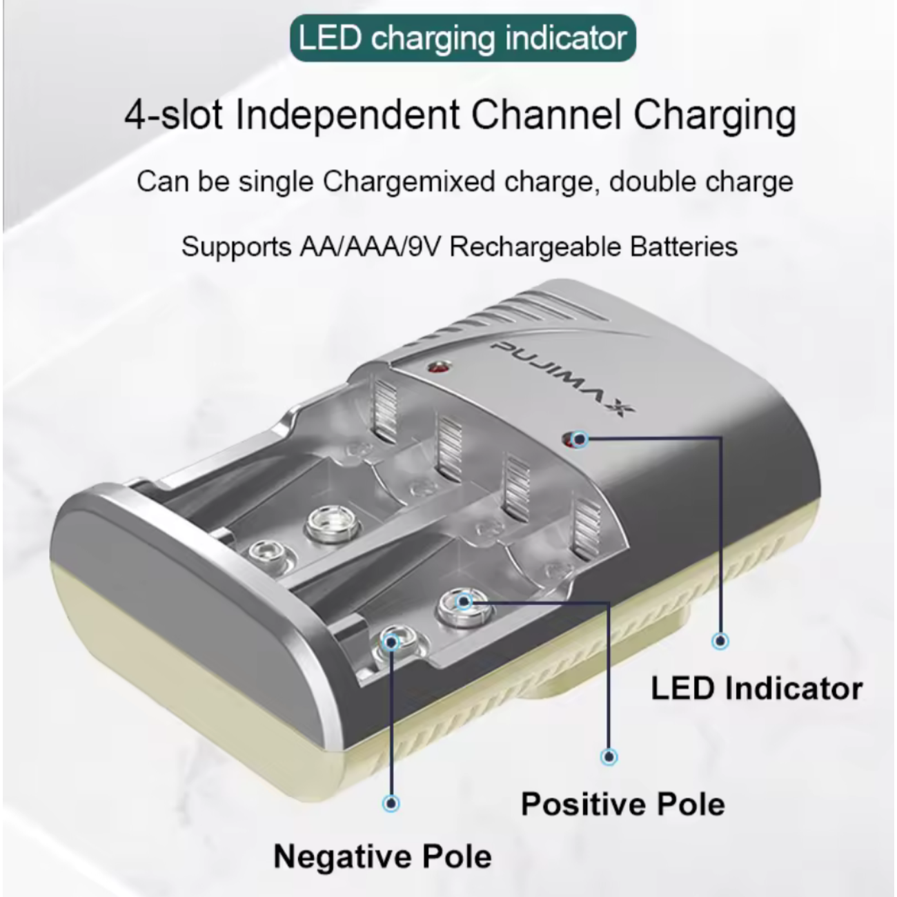 Su salida de DC 2.4V para AA (200mA), AAA (100mA) y 9V (40mA) asegura una carga rápida y segura, prolongando la vida útil de tus baterías y reduciendo el gasto en reemplazos constantes. Además, su diseño compacto y fácil de usar lo convierte en un accesorio imprescindible para hogares, oficinas y talleres.