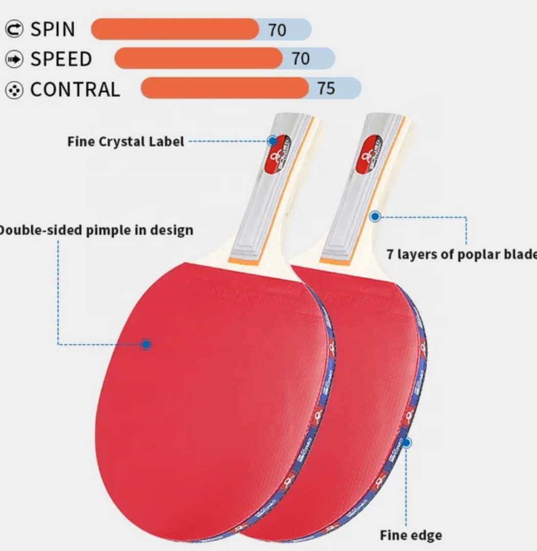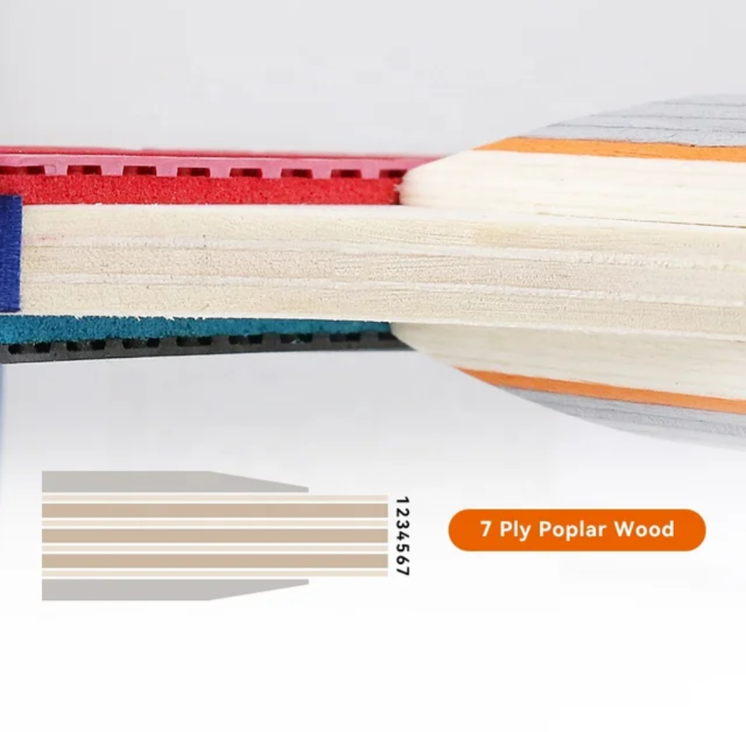 Pack de 2 paletas de Ping Pong Semi Profesional 5 estrellas con 7 capas de madera de Álamo, + malla Adaptable a cualquier mesa, + 3 pelotas de Ping Pong + bolsa.