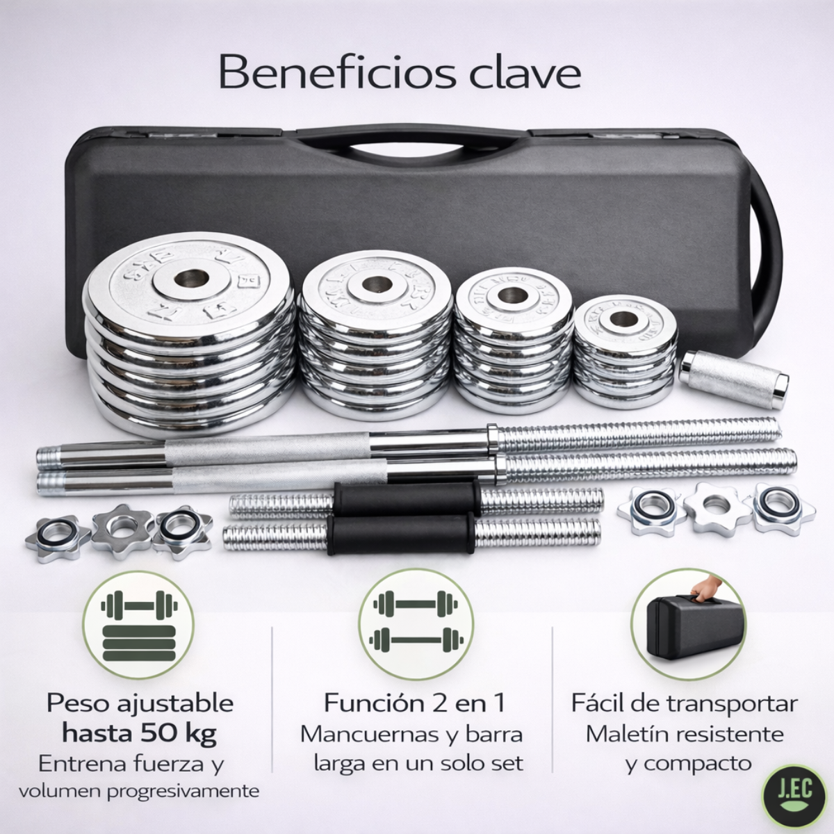 Incluye una maleta rígida con ruedas que facilita el transporte y almacenamiento, protegiendo cada componente y manteniendo tu espacio siempre organizado. Ideal para entrenamientos de brazos, pecho, espalda, hombros y core, este set convierte cualquier lugar en tu gimnasio personal.